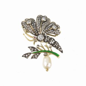 SPILLA A FORMA DI FARFALLA CON DIAMANTI in oro e argento, impreziosita da un piccolo rubino e da diamanti taglio [..]