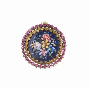 SPILLA/PENDENTE CON MOTIVO FLOREALE in oro e argento, di forma rotonda, con parte centrale entro cornice decorata [..]