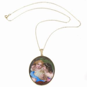 COLLANA CON PENDENTE IN SMALTI POLICROMI in oro 14kt, con ciondolo ovale di dim. cm 3,5x5 circa decorato in smalto [..]