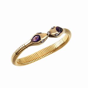 BRACCIALE TUBOGAS CON AMETISTE E DIAMANTI in oro giallo 18kt, chiusura a forma di doppia testa di serpente impreziosita [..]