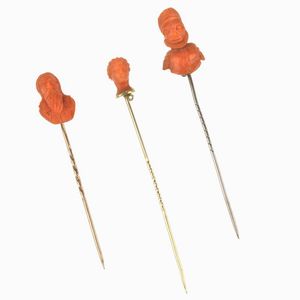 GRUPPO DI SPILLI di cui due in oro a basso titolo e uno in argento, con parti sommitali in corallo inciso raffiguranti [..]