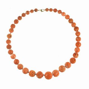 COLLANA IN CORALLO GREZZO composta da una fila di boules in corallo digradanti di mm 20-9 circa, chiusura a moschettone [..]