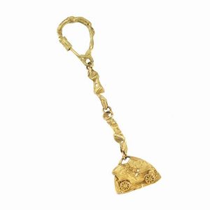 PORTACHIAVI in oro giallo 18kt, con ciondolo raffigurante una macchina, chiusura a gancio, punzone 750, lungh. [..]