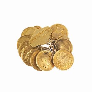 GRUPPO DI TREDICI MEDAGLIETTE unite tutte ad un anello centrale in oro a basso titolo, gr. 76 GROUP OF THIRTEEN [..]