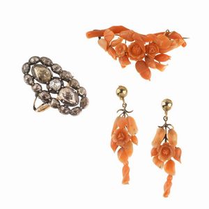LOTTO COMPOSTO DA DEMI PARURE IN CORALLO E ANELLO A LOSANGA anello in oro e argento, impreziosito da rose di [..]