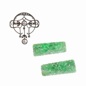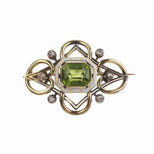 SPILLA CON DIAMANTI in oro e argento, impreziosita al centro da una pasta vitrea verde sfaccettata e diamanti [..]