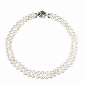 COLLANA DI PERLE realizzata a doppio filo di perle di mm 7 circa, fermatura in oro bianco 18kt, lungh. cm 42, [..]