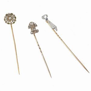 GRUPPO DI SPILLI di cui due in oro giallo e bianco e un terzo in oro e argento, impreziositi da pietre di colore [..]
