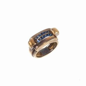 ANELLO CON ZAFFIRI SINTETICI in oro 18kt, impreziosito da una doppia fila di zaffiri sintetici calibrati, mis. [..]