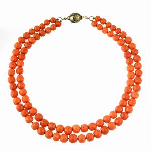 COLLANA DI CORALLO realizzata a doppio filo di barilotti sfaccettati in corallo digradanti da mm 10x8 circa a [..]