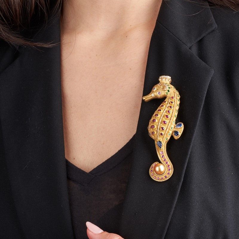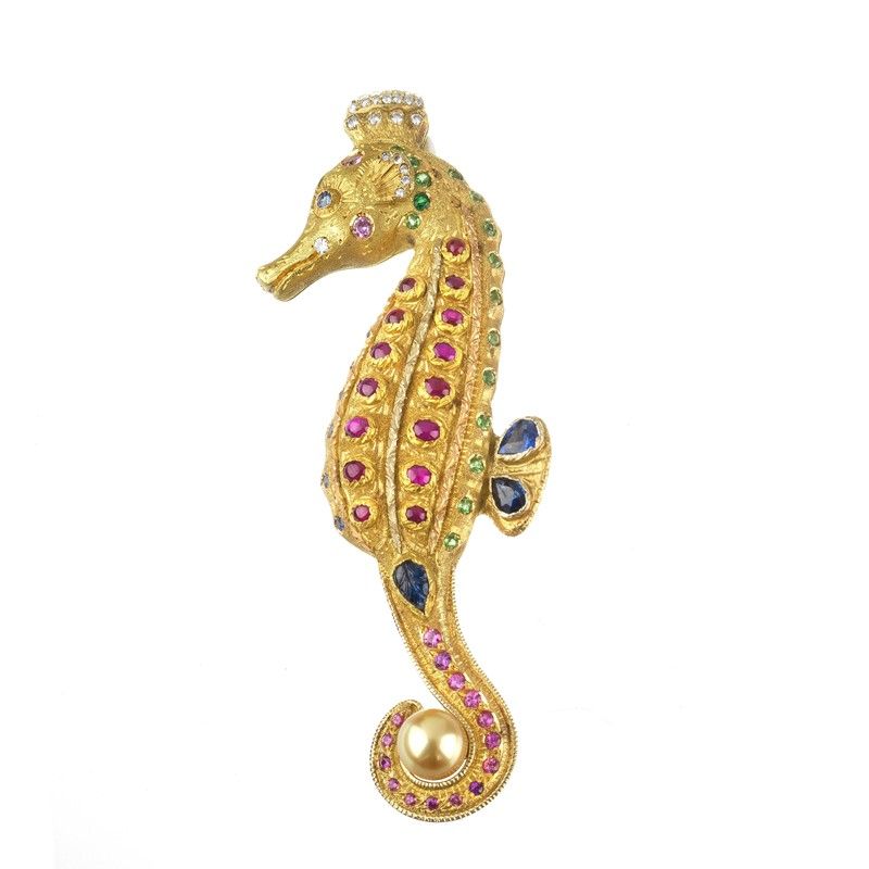 SEAHORSE-SHAPED MULTI GEM BROOCH IN THREE TONE GOLD