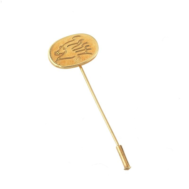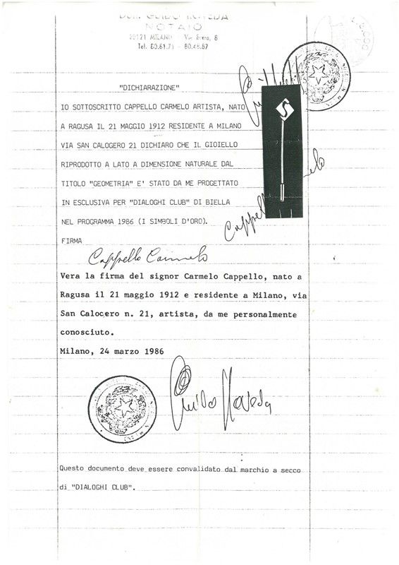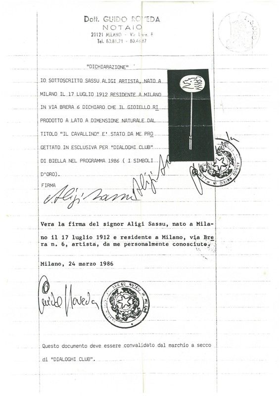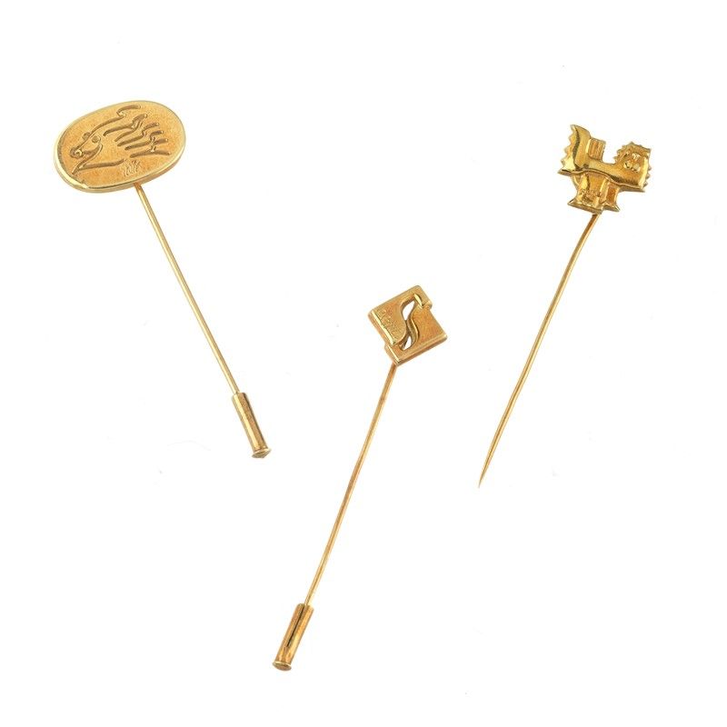 di cui una spilla "Galletto" di Salvatore Fiume in oro giallo 18kt, firmata "Fiume", dim. cm 1x5,5 circa, corredata di custodia Dialoghi Club, certificato d'origine e dichiarazione di autenticità del 24/03/1986; una spilla "Geometria" di Cappello Carmelo in oro giallo 18kt, firmata "C.Cappello", dim. cm 1x6 circa, corredata di custodia Dialoghi Club e copia di dichiarazione di autenticità del 24/03/1986; accompagnati da una terza spilla "Il Cavallino" di Aligi Sassu, in oro giallo 18kt, firmata "Sassu", dim. cm 2x5,5, corredata di custodia Dialoghi Club, certificato d'origine e copia di dichiarazione di autenticità del 1986, punzoni 750, del fabricante e firma " Dialoghi Club", gr. 5 complessivi circa