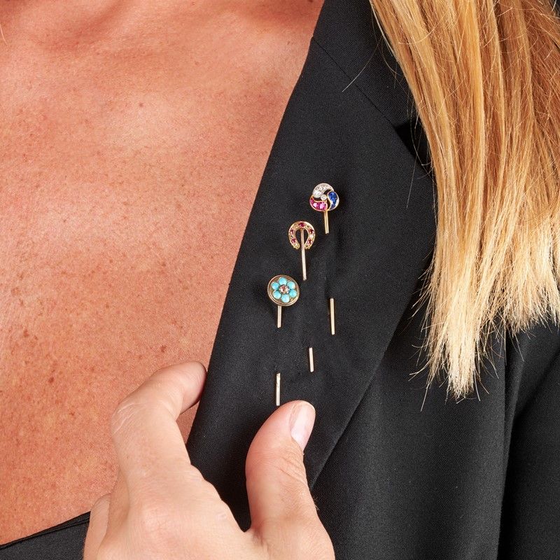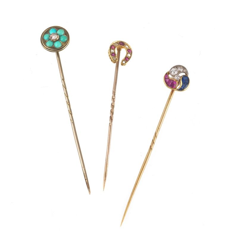 in oro a basso titolo, impreziositi da pietre di colore, turchesi e diamanti, lungh. cm 6 e 5,5, gr. 5 complessivi
