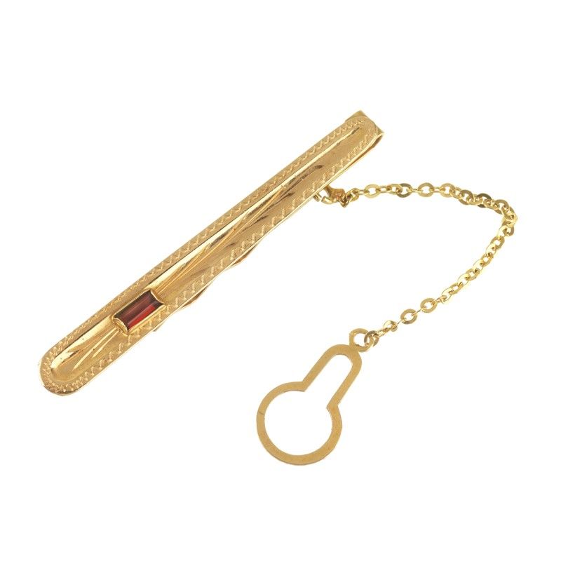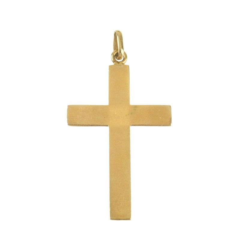 in oro giallo 18kt, composto da un fermacravatte, dim. cm 0,5x5 circa, due sterline in oro, diam. mm 22; un pendente a forma di croce, punzoni 750 e del fabbricante, dim. cm 2,5x4,5; accompagnati da due sterline in oro diam. mm 22, gr. 22 complessivi