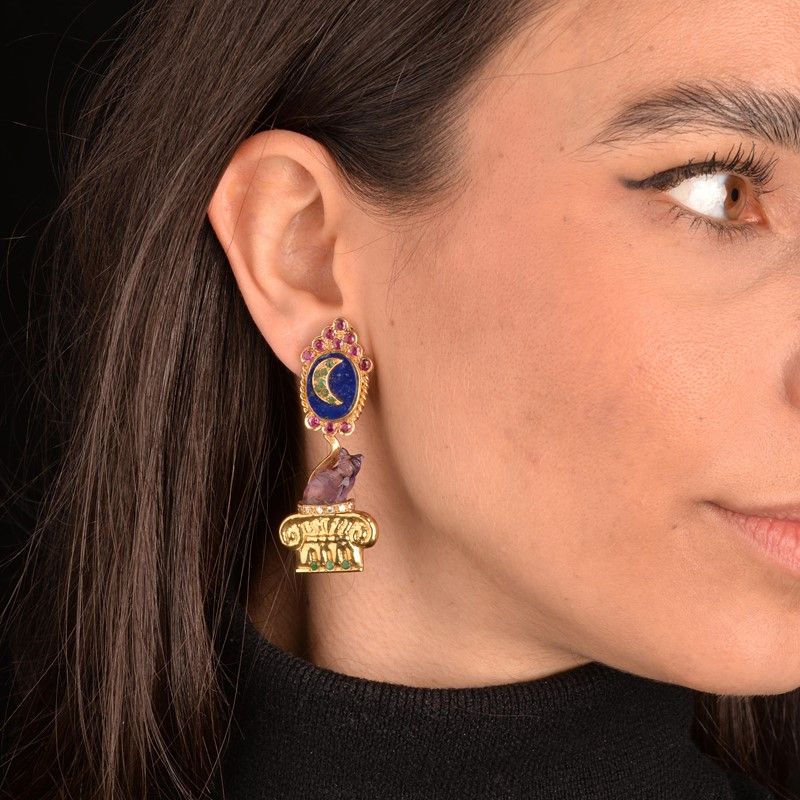 in oro giallo 18kt, impreziositi da rubini e smeraldi taglio rotondo per ct 2 circa, diamanti taglio brillante per ct 0.20 circa, con parti in lapislazzuli da cui pendono due ametiste a forma di gatto che poggiano su due colonne, firmati "Moroni", punzoni 750 e del fabbricante, chiusura a clip, dim. cm 2,5x6 circa, gr. 27 complessivi