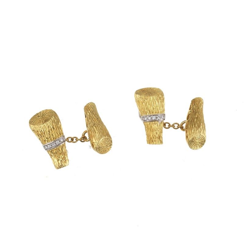 PAIO DI GEMELLI A FORMA DI TRONCHI DI LEGNO in oro giallo e bianco 18kt, lavorati a incisione, impreziositi da diamanti taglio brillante per ct 0.15 circa, punzoni 750 e del fabbricante, dim. cm 2x2,5 circa, gr. 19 complessivi