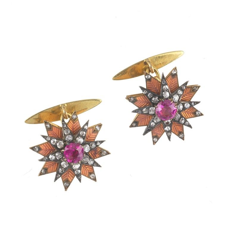 PAIO DI GEMELLI STELLATI CON RUBINI E DIAMANTI in oro e argento, decorati in smalto, impreziositi al centro da due rubini taglio rotondo e diamanti taglio vecchio e a rosa per ct 0.5 circa, dim. cm 1,5x1,5x2 circa, gr. 11 complessivi