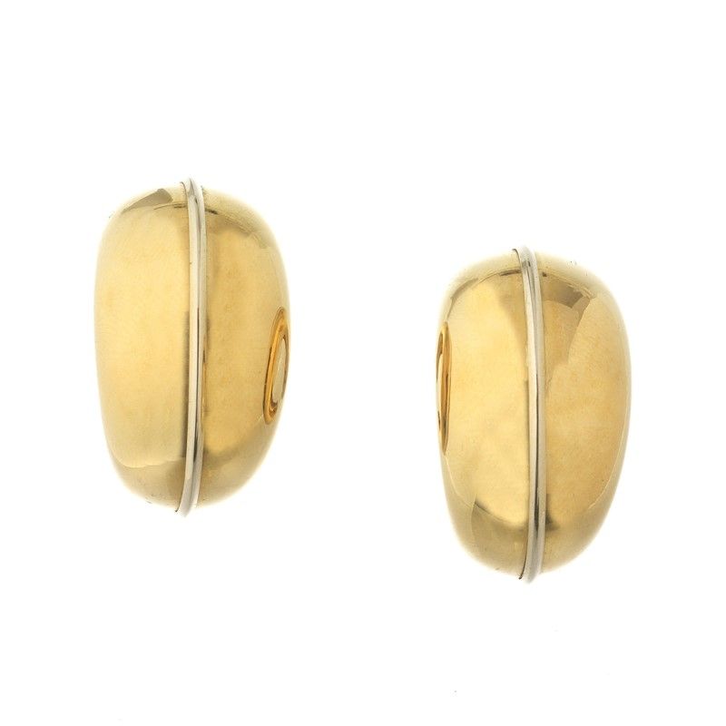 in oro giallo 18kt, di forma bombata, punzone 750 e firma del fabbricante, dim. cm 2x3x3,5, gr. 17 complessivi
