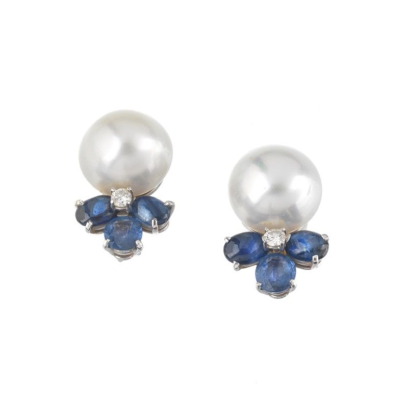 PAIO DI ORECCHINI CON PERLE SOUTH SEA ZAFFIRI E DIAMANTI in oro bianco 18kt, impreziositi da perle south sea di mm 14x12 circa, zaffiri taglio ovale e cabochon per ct 7.60 circa e due diamanti taglio brillante per ct 0.20 circa, punzone 750, chiusura a clip. dim. cm 1,5x2 circa, gr. 19 complessivi