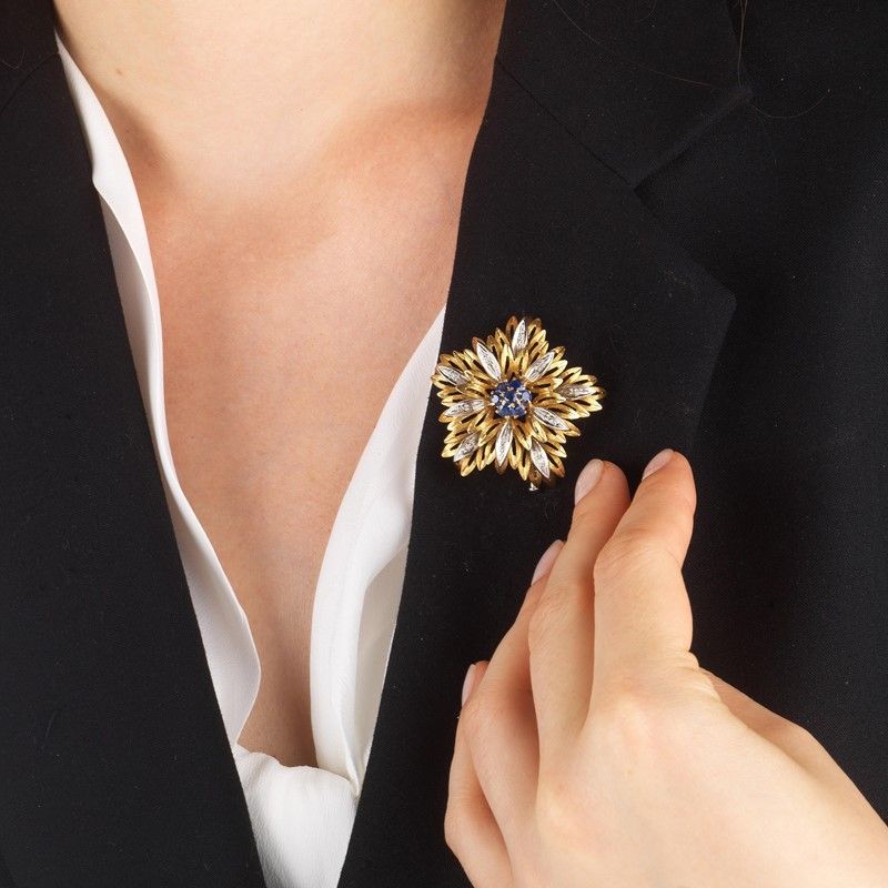 in oro giallo e bianco 18kt, impreziosita da zaffiri taglio rotondo per ct 0.80 circa e diamanti taglio huit huit per ct 0.10 circa, punzone 18kt, dim. cm 3,5x3,5 circa, gr. 18