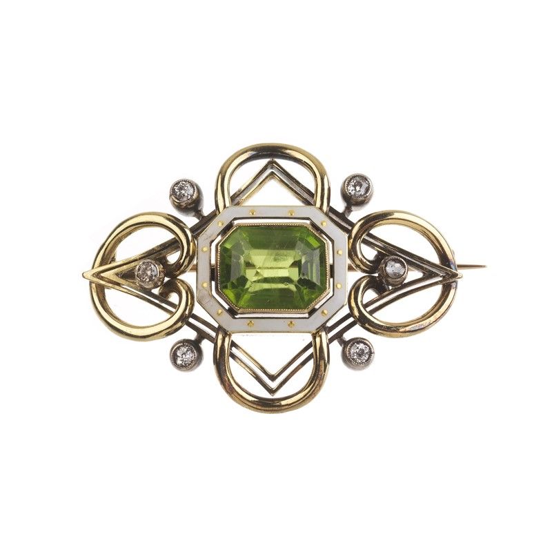 in oro e argento, impreziosita al centro da una pasta vitrea verde sfaccettata e diamanti taglio vecchio per ct 0.60 circa, dim. cm 5x3,5, gr. 21