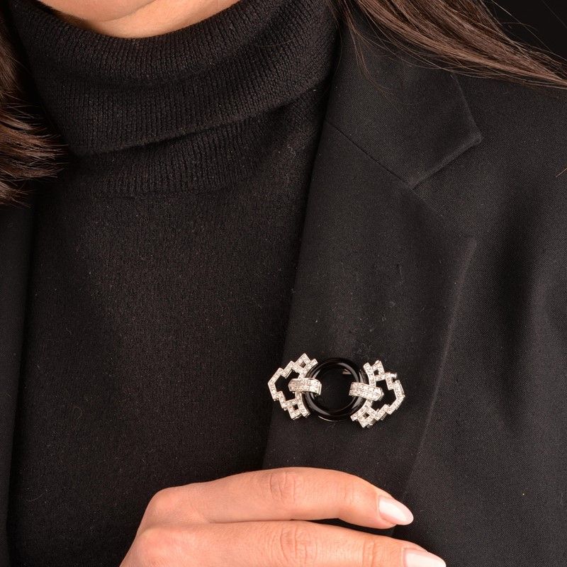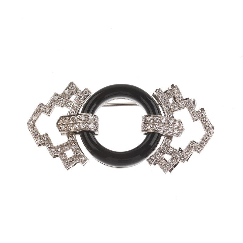 ONYX AND DIAMOND BROOCH IN 18KT WHITE GOLD