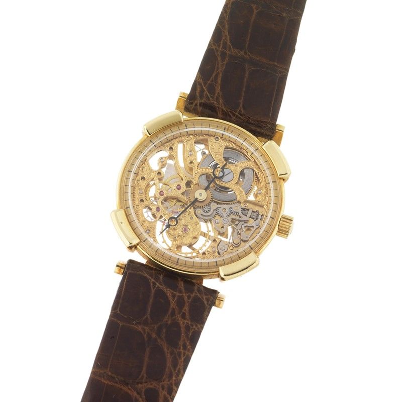 LA VALLEE SQUELETTE OROLOGIO DA DONNA cassa scheletrata in oro giallo 18kt, fondello serrato con viti con movimento a vista, corona marcata, lancette breguet, movimento a carica automatica, cinturino originale in pelle marrone, fibbia in oro giallo 18kt marcato La Vallèe, vetro plastica, gr. 18 circa. Diam. mm 25. Corredato di scatola.