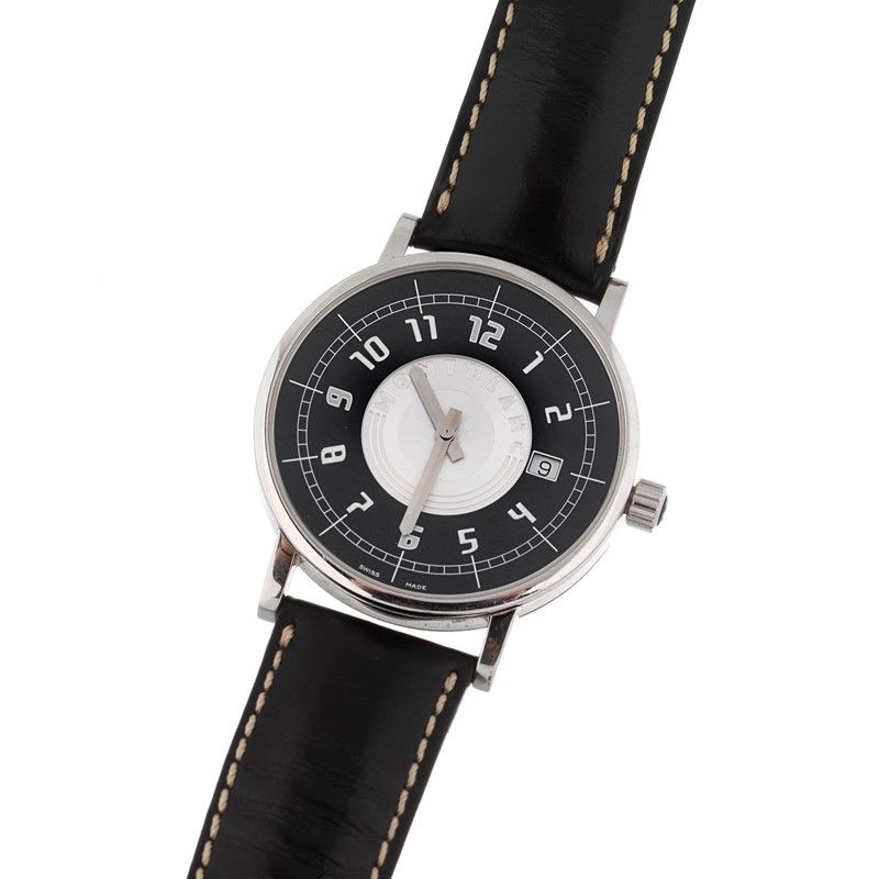 cassa in acciaio, fondello a pressione, lunetta liscia in acciaio, corona con emblema a stella bianca, quadrante bitonale nero e argentè, grafica bianca, datario a ore tre, numeri arabi stampati, movimento al quarzo, cinturino originale in pelle nera, fibbia in acciaio marcata Montblanc, vetro minerale. Diam. mm 38