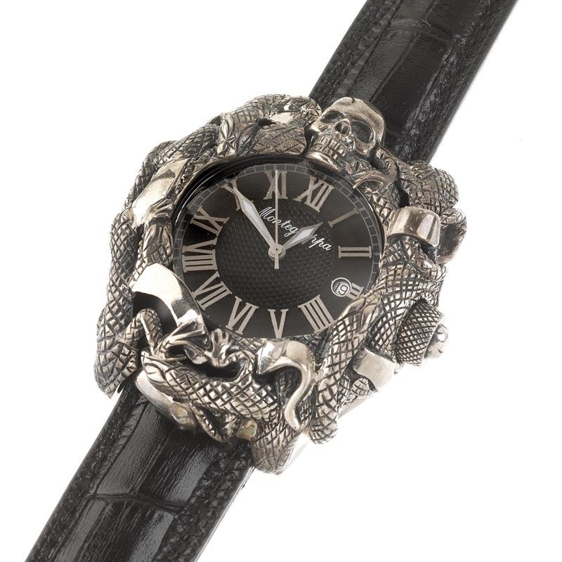 cassa in acciaio, fondello serrato a vite con teschio in rilievo, decorazione soprastante la cassa in argento sterling, punzone 925, raffigurante intreccio di draghi e teschio, corona con teschio in rilievo, quadrante nero, grafica bianca, numeri romani applicati, datario a ore tre, movimento a carica automatica, cinturino originale in pelle nera, fibbia in argento sterling firmata Montegrappa, vetro minerale, gr. 154. Dim. mm 45x55. Corredato di scatola e garanzia.