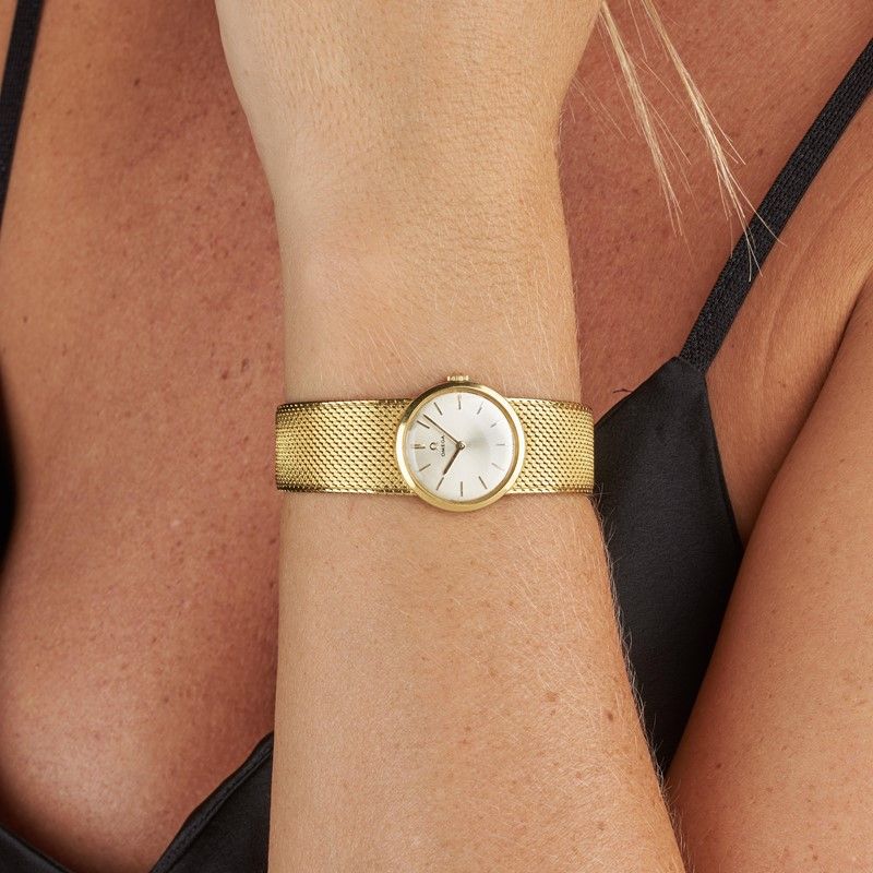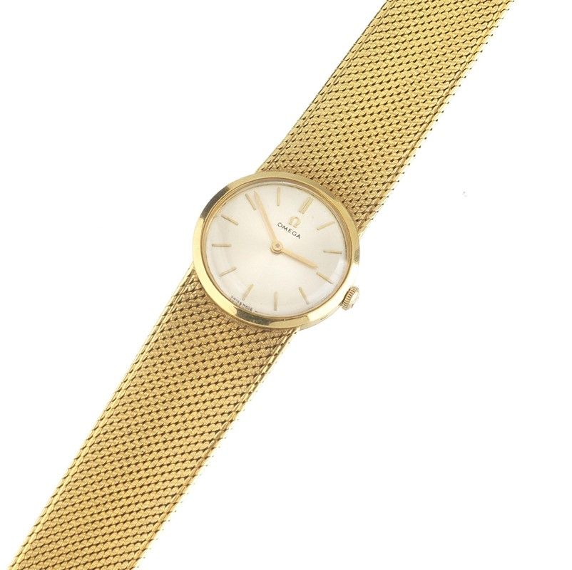 cassa in oro giallo 18kt, fondello a pressione, corona marcata, lunetta in oro giallo, quadrante argenté, grafica nera, indici applicati, movimento a carica manuale cal 620 n. 20856423, bracciale integrato in oro giallo 18kt a maglia tessita con chiusura a scomparsa in oro giallo marcata Omega, vetro plastica, gr. 58. Diam. mm 24