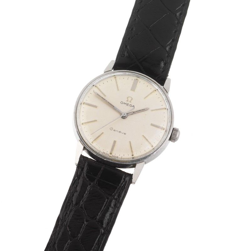 OMEGA REF. 135.011 OROLOGIO DA POLSO cassa in acciaio, fondello serrato a vite, quadrante argenté ristampato, indici applicati, movimento a carica manuale cal 601 n. 26667417, cinturino non originale in pelle nera, fibbia in metallo dorato, vetro plastica. Diam. mm 33