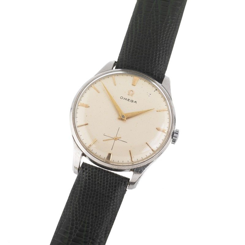 OMEGA REF. 2890-3 OROLOGIO DA POLSO cassa in acciaio, fondello a pressione, quadrante argenté ristampato, indici applicati, movimento a carica manuale cal 267 n. 15859912, cinturino non originale in pelle verde, fibbia in metallo dorato marcato Tissot, vetro plastica. Diam. mm 35
