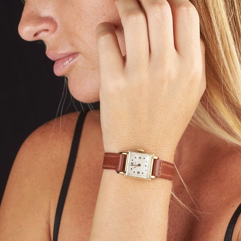 ORIENTAL OROLOGIO DA DONNA cassa di forma in oro giallo 18kt, fondello a pressione, quadrante argenté ristampato (difetti), indici e numeri arabi, secondi a ore sei (lancetta mancante), movimento a carica manuale, cinturino non marcato in pelle marrone, fibbia in metallo dorato, gr. 18. Dim. mm 20x31