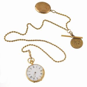TRE OROLOGI DA TASCA Un orologio Pre Rigaud dalla cassa in due parti in metallo, quadrante bianco in porcellana [..]
