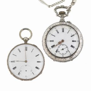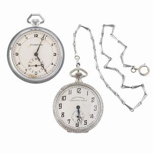 DUE OROLOGI DA TASCA Un orologio da tasca Floretta dalla cassa in metallo, fondello decorato a linee verticali [..]