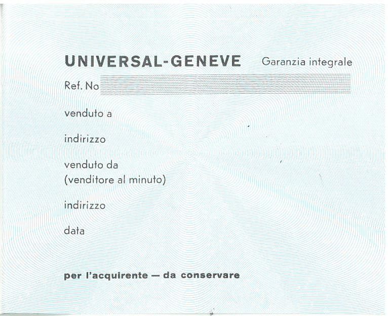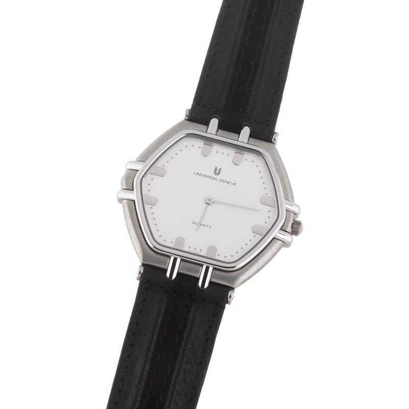 UNIVERSAL GENEVE REF. 817 100 cassa di forma in acciaio satinato, fondello serrato con viti, lunetta in acciaio, quadrante bianco, indici applicati, movimento al quarzo, cinturino originale in pelle nera, fibbia in metallo marcata Universal Geneve, vetro minerale. Dim. mm 33x30 Corredato di scatola e garanzia.
