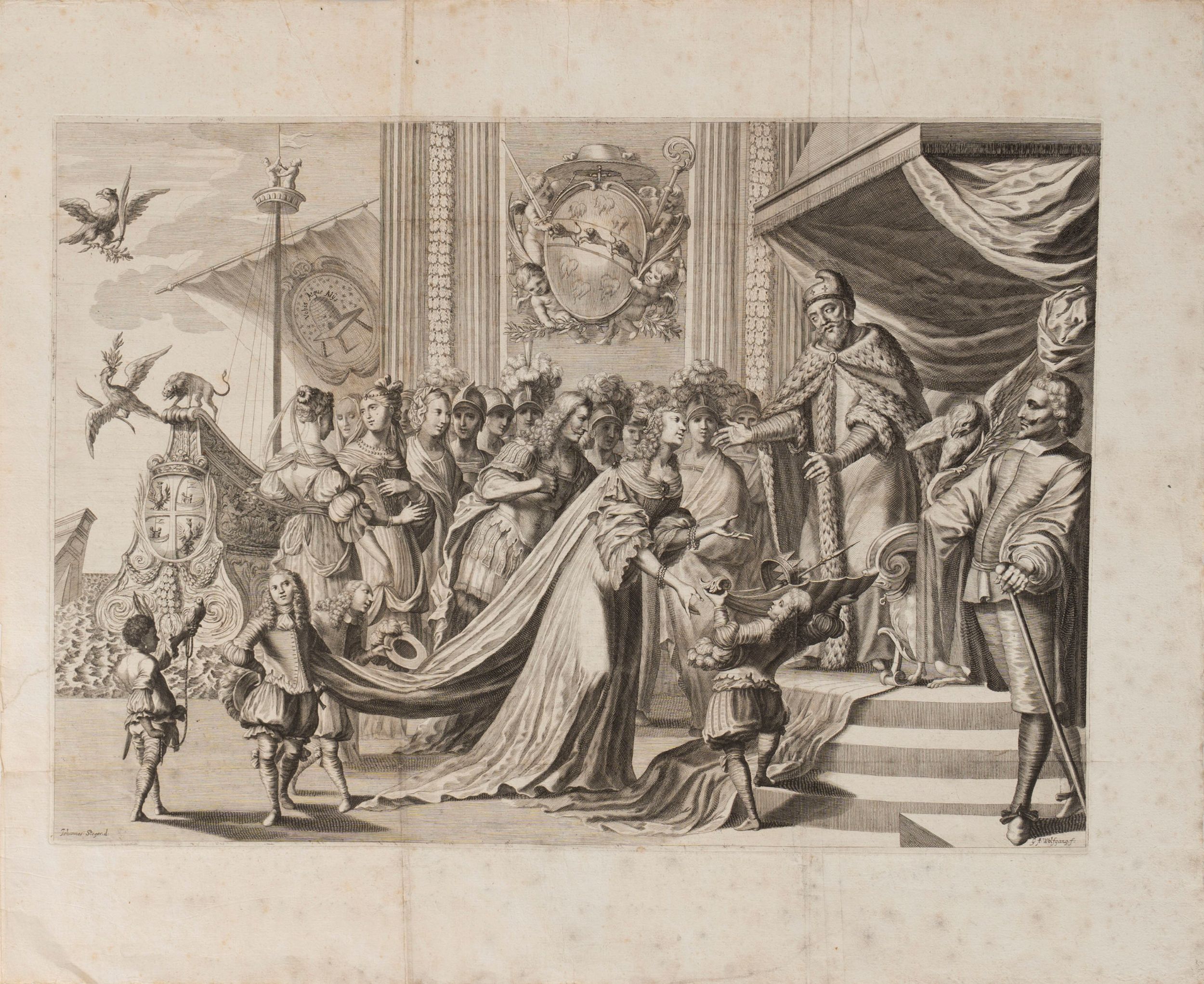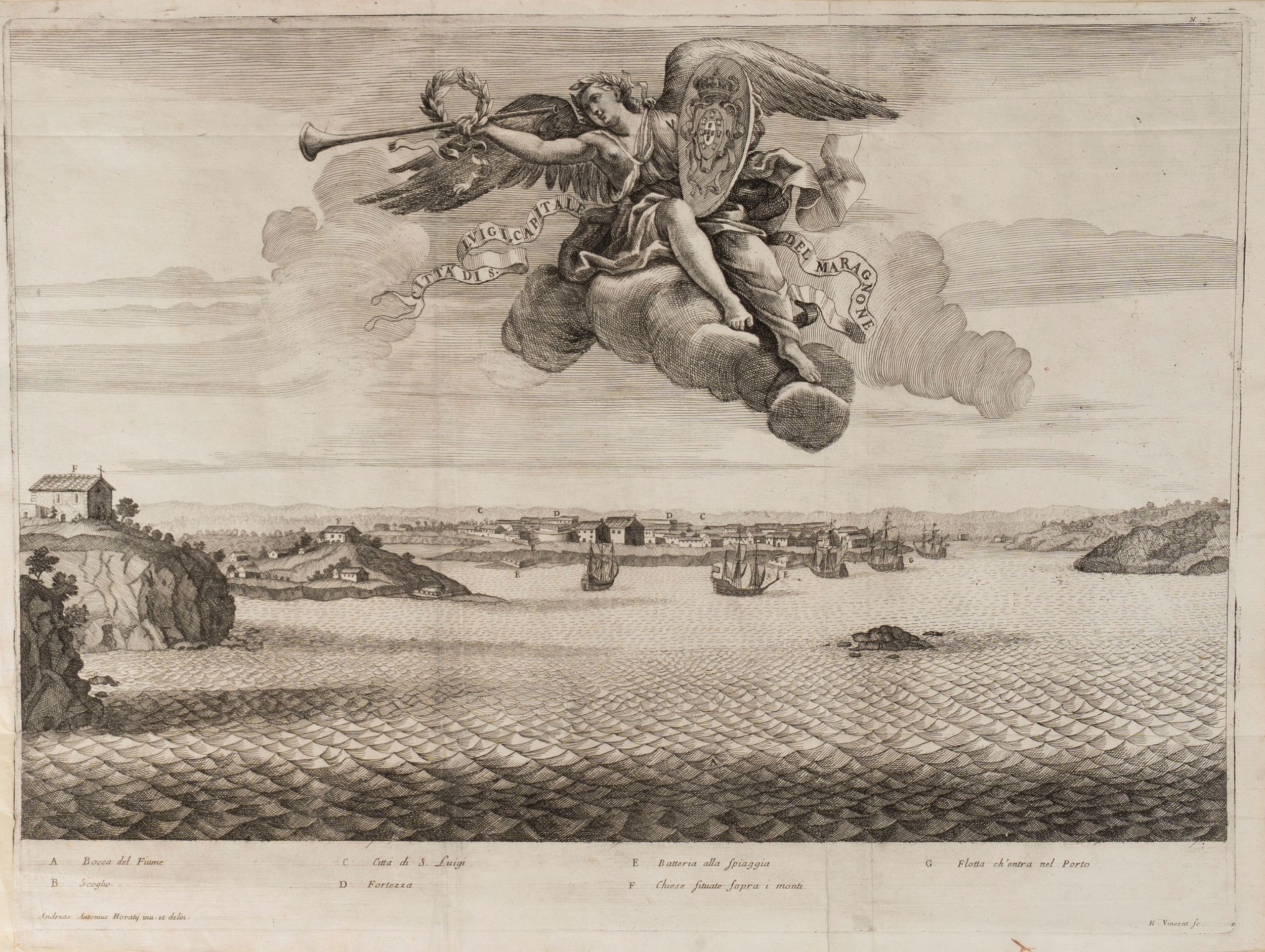 1698 Acquaforte, 384 x 515 mm, firmata in lastra, proveniente da Istoria delle guerre del regno del Brasile, Roma, Eredi del Corbelletti, 1698, applicata su carta, piccoli margini, parte del lato sinistro rifilato al rame, tracce di piegatura. § Pieter van der Aa. Amoenissimus Pausilypi prospectus. Acquaforte, [1729], 270 x 345 mm, su foglio intero, proveniente da La Galerie agreable du monde... divisée en LXVI tomes, piega centrale, lieve brunitura. Insieme nel lotto La desfaite de S. Gilles en Languedoc, au mois de Septembre 1562, una xilografia; una carta geografica della Sicilia incisa in rame pubblicata da Luigi Ronchi, secolo XIX; un'acquaforte raffigurante Caterina Cornaro di fronte al Doge Agostino Barbarigo incisa da G.H. Wolfgang.