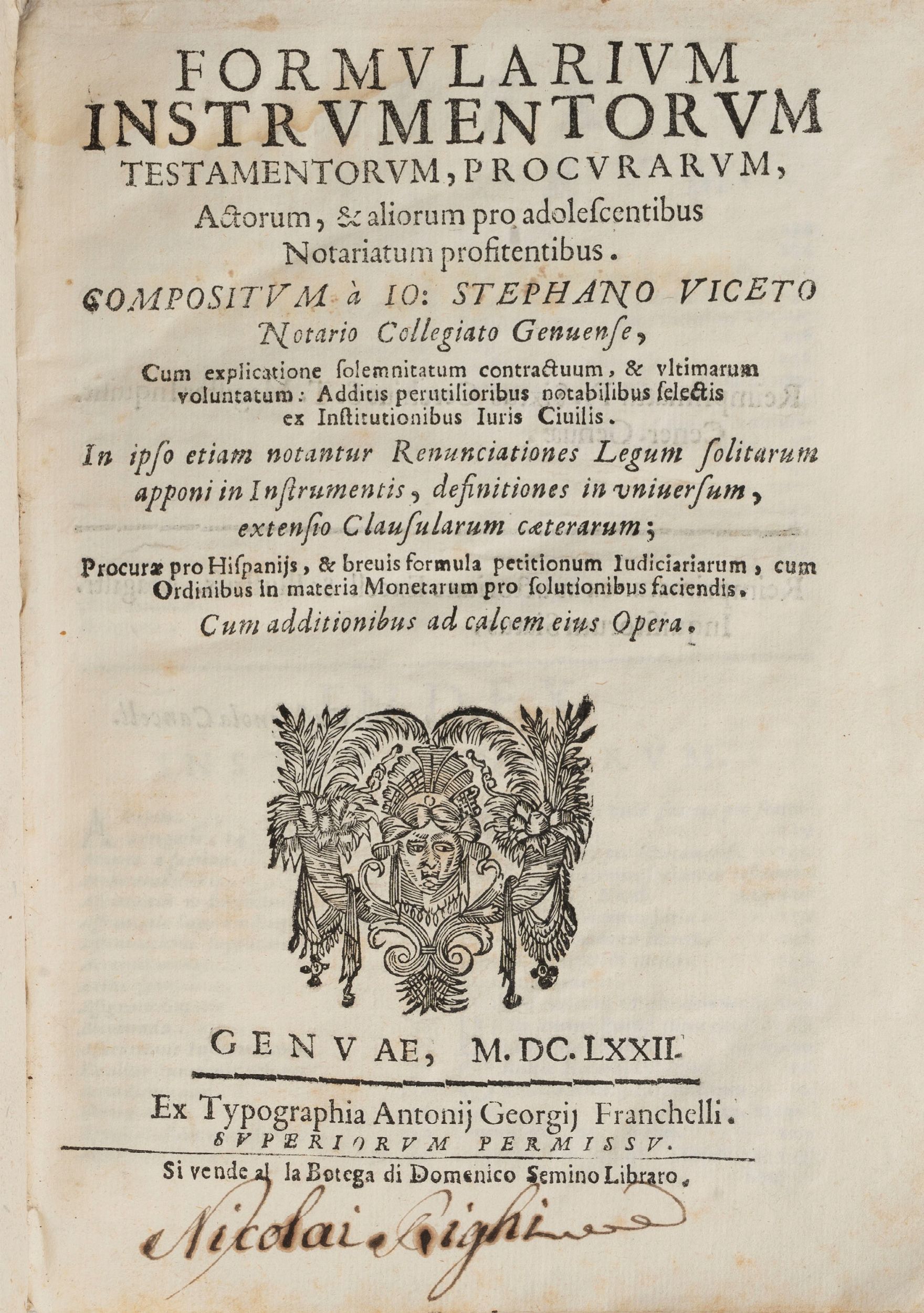 1672 Genova, Franchelli, 1672. In 8°. Fregioxilografico al frontespizio, leggera gora d'acqua al margine superiore delle prime carte, legatura coeva in pergamena, titolo manoscritto al dorso, lievi difetti. Firma di appartenenza al frontespizio, ex libris cartaceo Guido Manganelli al contropiatto.