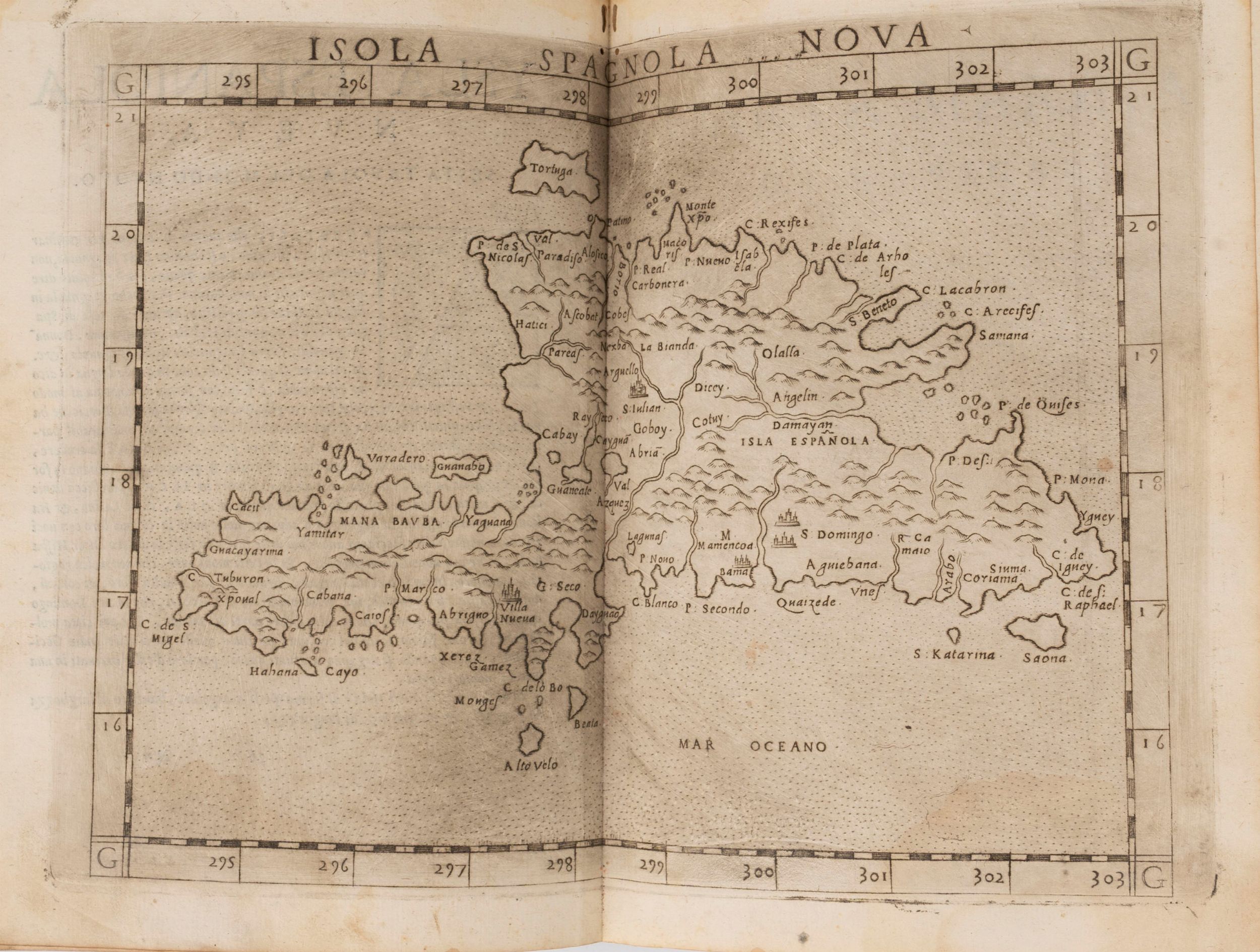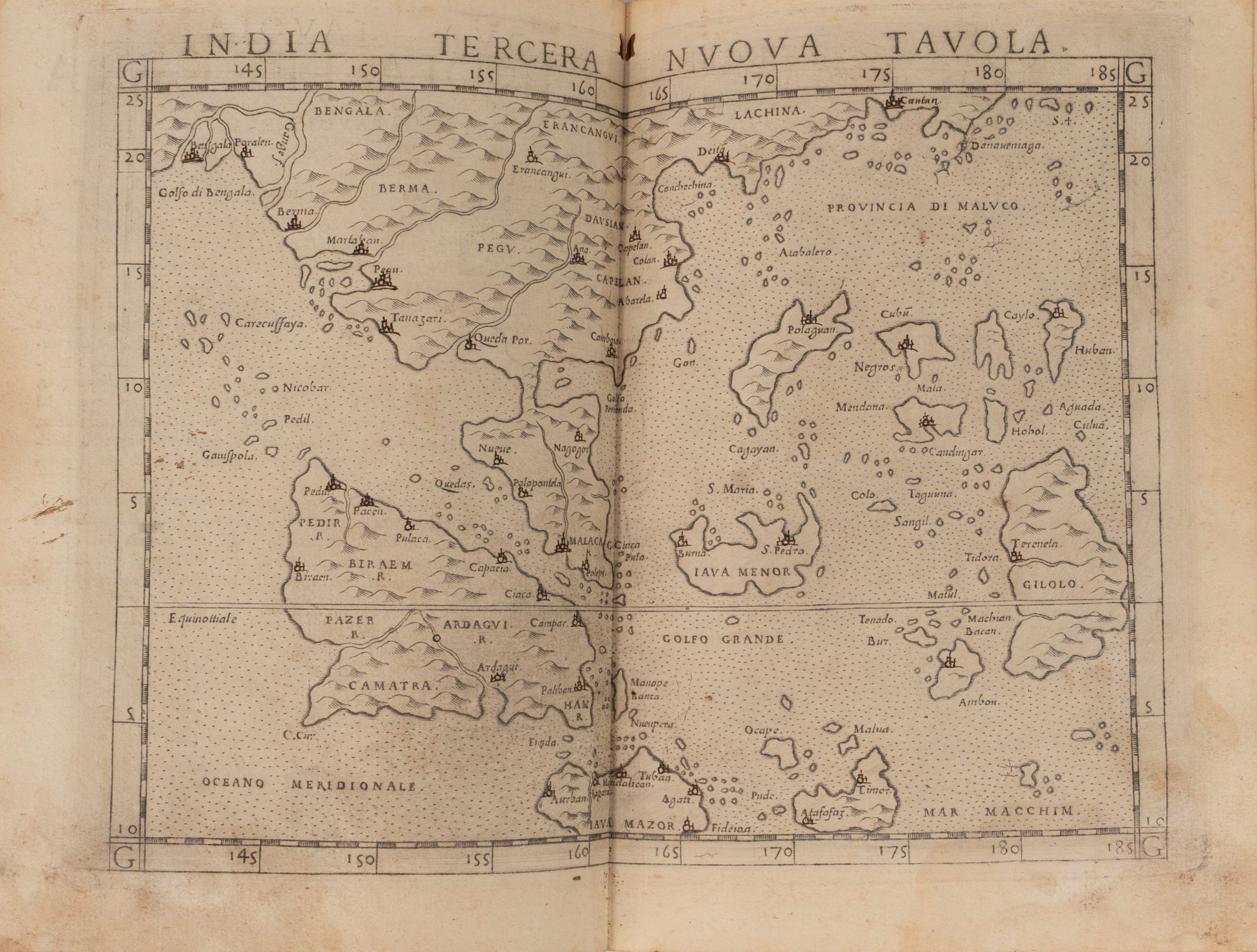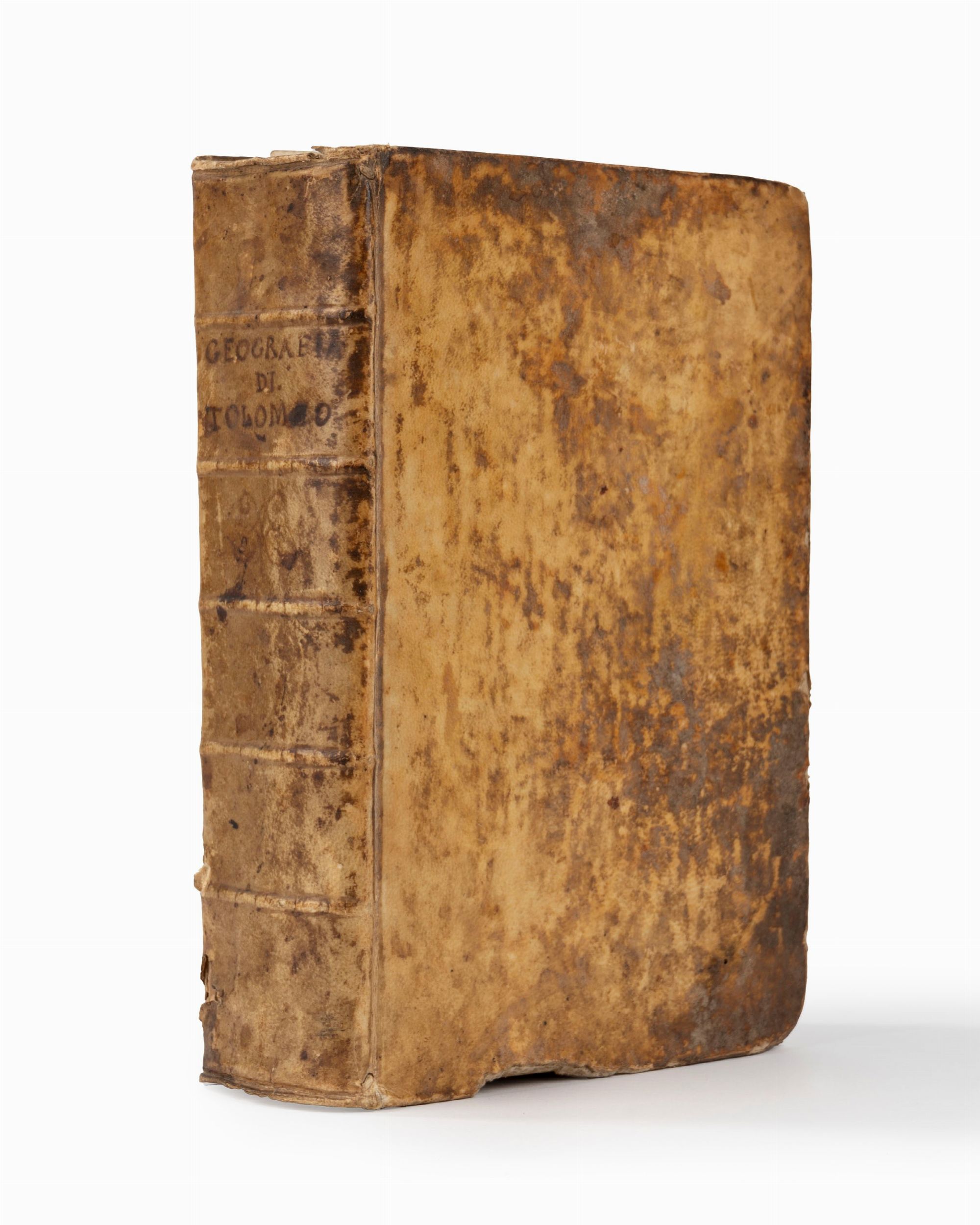 Venezia, Giordano Ziletti, 1574. In 4°. 3 parti in 1 volume. Con 65 carte geografiche a doppia pagina, di cui 27 dedicate al mondo antico e 38 al mondo moderno con la descrizione al verso, diverse xilografie e diagrammi nel testo, diverse annotazioni manoscritte nel testo, restauro al frontespizio e all'ultima carta, margini delle prime carte leggermente sciupati, tracce di umidità , lavoro di tarlo al margine interno di alcune carte, piccolo foro alla Tabula Europae I, piccola mancanza al margine di Tabula Asiae I e III, leggera abrasione e piccola macchia alla tavola della Nueva Hispania, alcune macchie, lievi fioriture, leggera brunitura, legatura coeva in pergamena, difetti e piccole mancanze a dorso e margine del piatto anteriore.