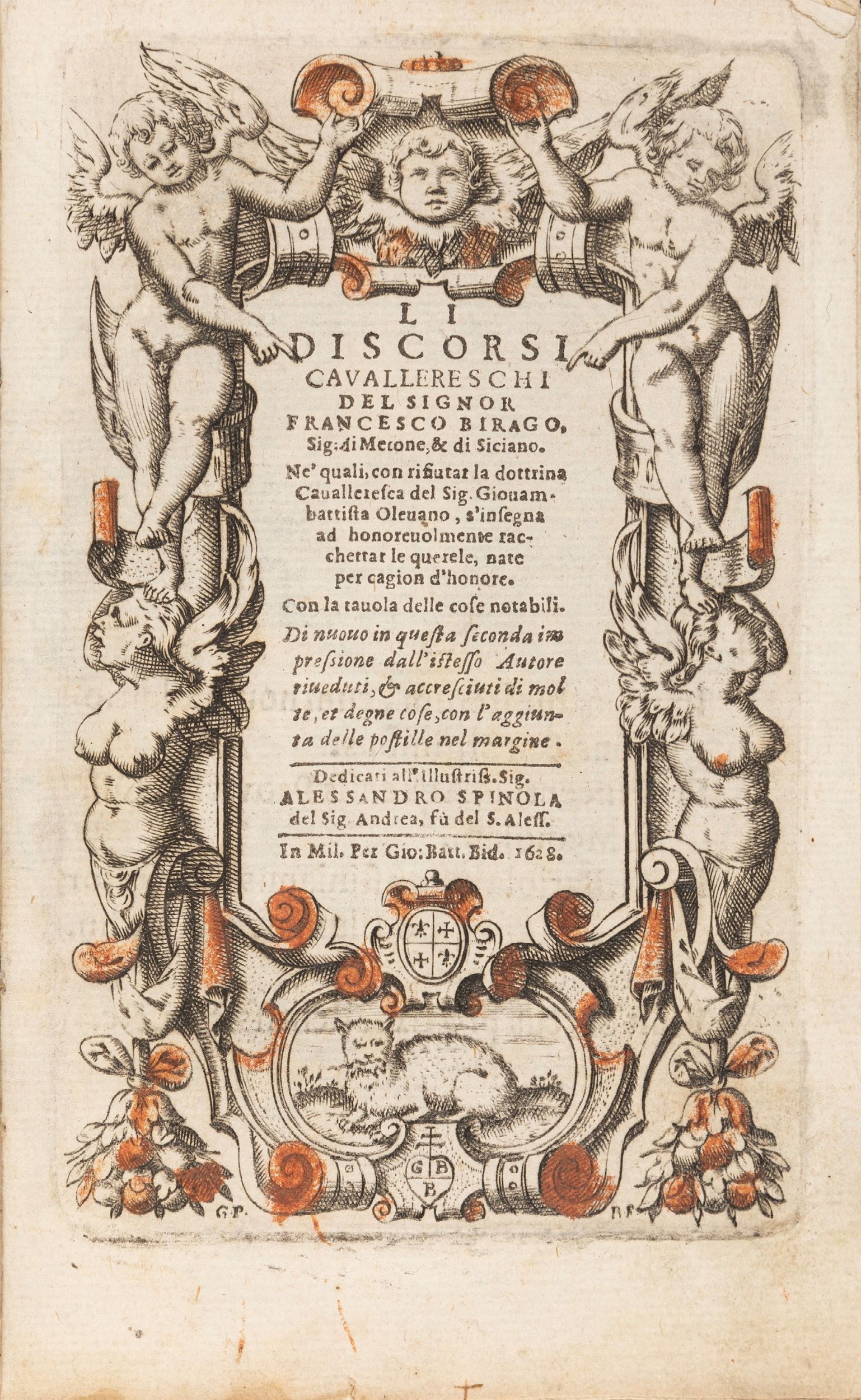 1628 Milano, per Giovan Battista Bidelli, 1628. In 8°. Marca tipografica sul frontespizio raffigurante un gatto con un topo in bocca in cornice ovale, in basso al centro iniziali GBB sormontate da doppia croce, ritratto in ovale dell'autore inciso da Gio. P. Bianchi, parziale coloritura del frontespizio, legatura coeva in cartonato. Ex libris manoscritti al foglio di guarda e uno stampato di Dionisi.