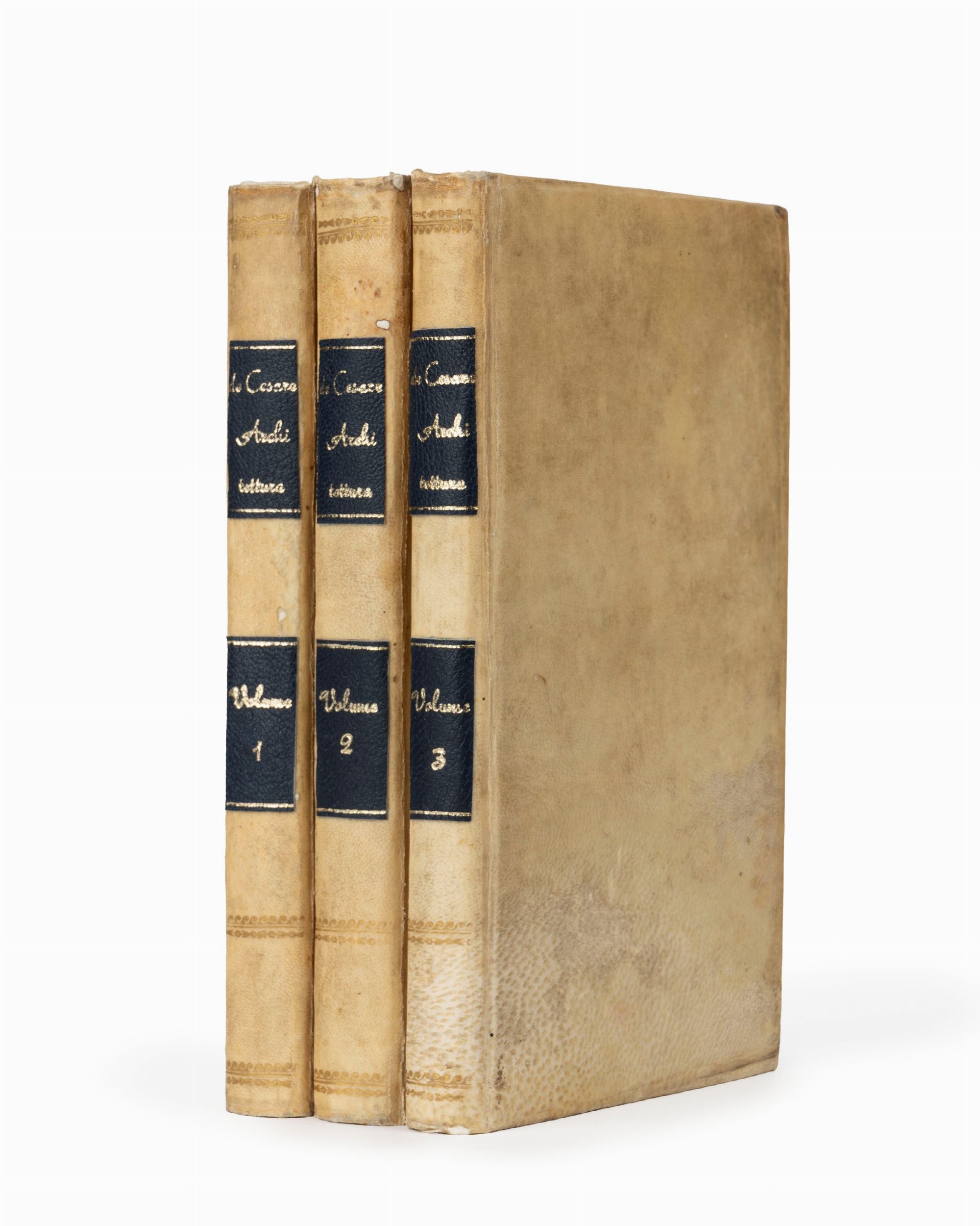 8°, voll. 3, pp. 278-(1), 287, 211 con 13 tavole incise su rame, ripiegate f.t. Restauro al margine bianco delle pagine del primo volume. Legatura coeva in piena pergamena.