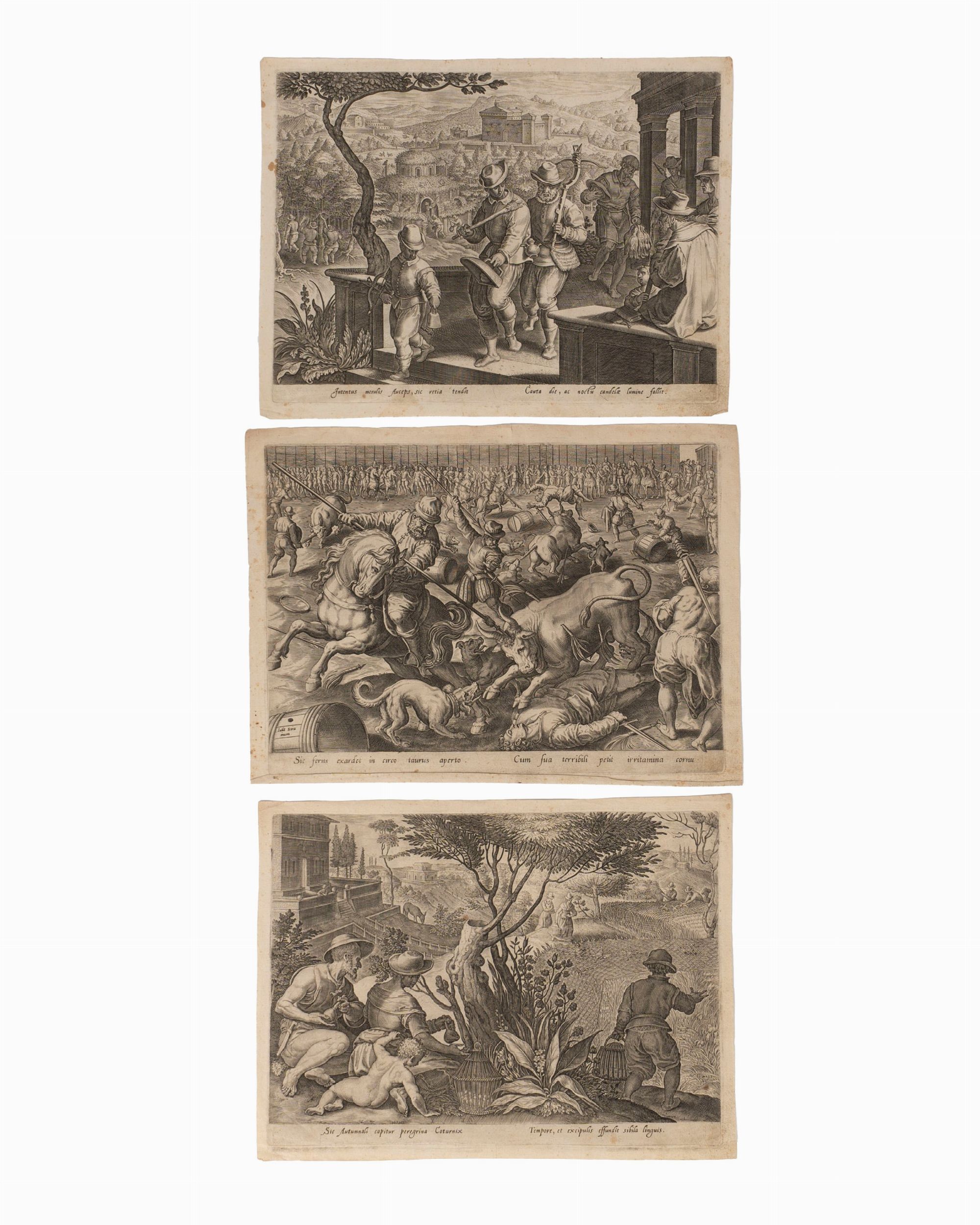 1580 3 tavole tratte da Venationes Ferarum, avium, piscium, pugnae bestiarum, Anversa, Philips Galle excudit, 1580-1596.(mm 232 x316): Sic ferus exardet in circo taurus aperto - Cum sua terribili petit iritamina cornu; Sic Autumnali capitur peregrina Coturnix Tempore, et excipulis effundit sibila linguis; Intentus merulis Auceps, sic retia tendit Cauta die, ac noctu candelae lumine fallit ciascuna con didascalia, una con firma dell'Autore in lastra, leggera brunitura, lievi fioriture, piccolo strappo senza perdita al margine bianco superiore di una incisione.