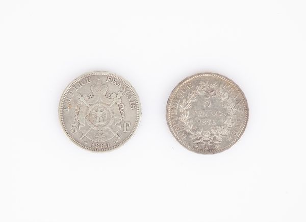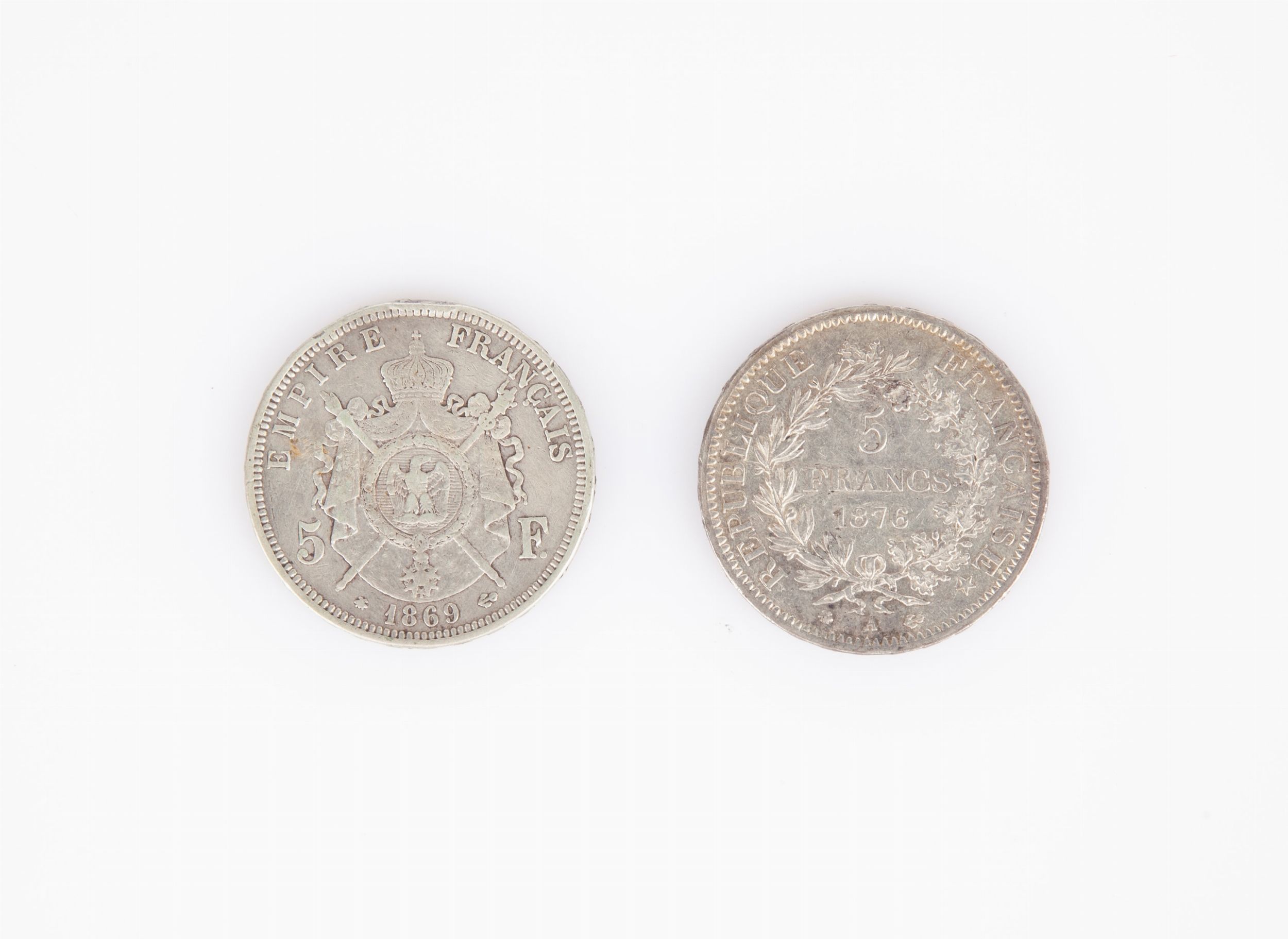 2 monete da 5 Franchi Francia: 1869 Parigi Napoleone III e 1876 Parigi Terza Rep [..]