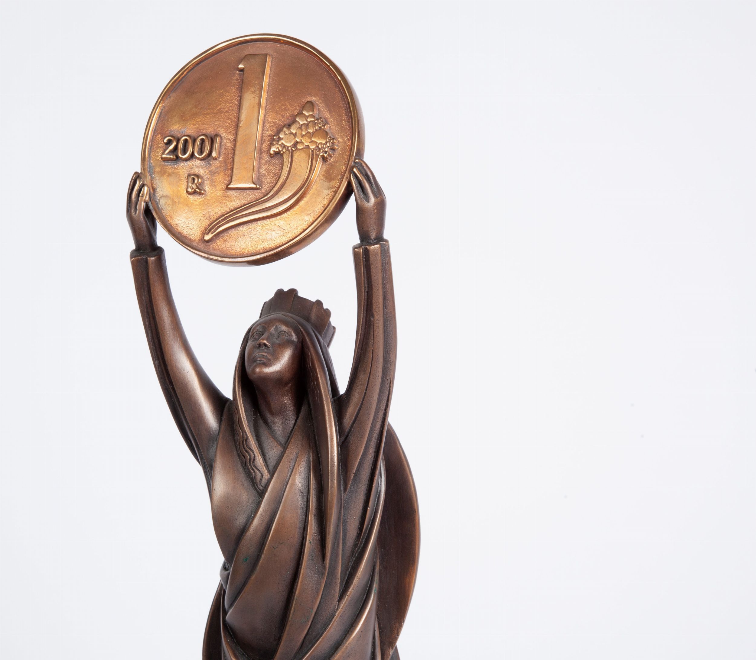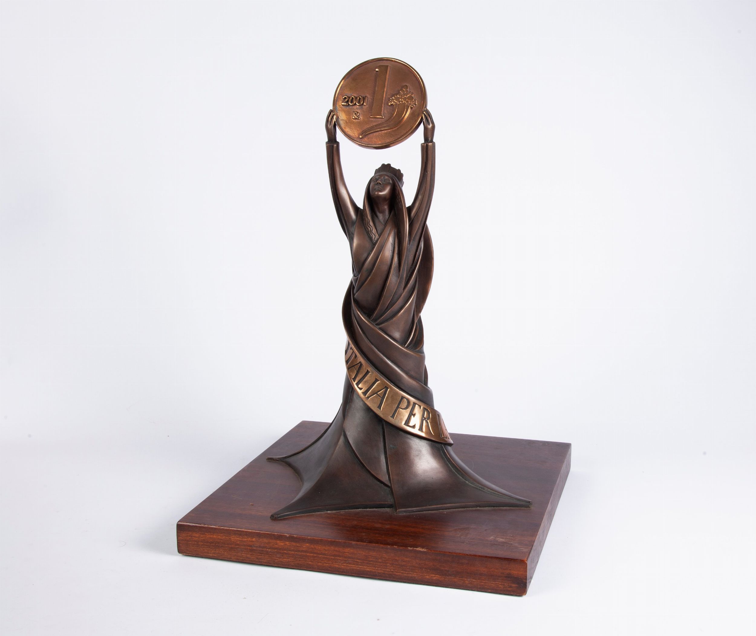 altezza massima cm 43 Opus Fusco, 2001 Tiratura di 199 esemplari, nostro 108. Scultura in bronzo a cera persa, brunito e patinato raffigurante l'allegoria dell'Italia Turrita che regge una moneta con al dritto una lira del 2001 e al rovescio una lira di Vittorio Emanuele II. Fonderia Venturi Arte, Bologna. Supporto di legno. Con libretto di accompagnamento.
