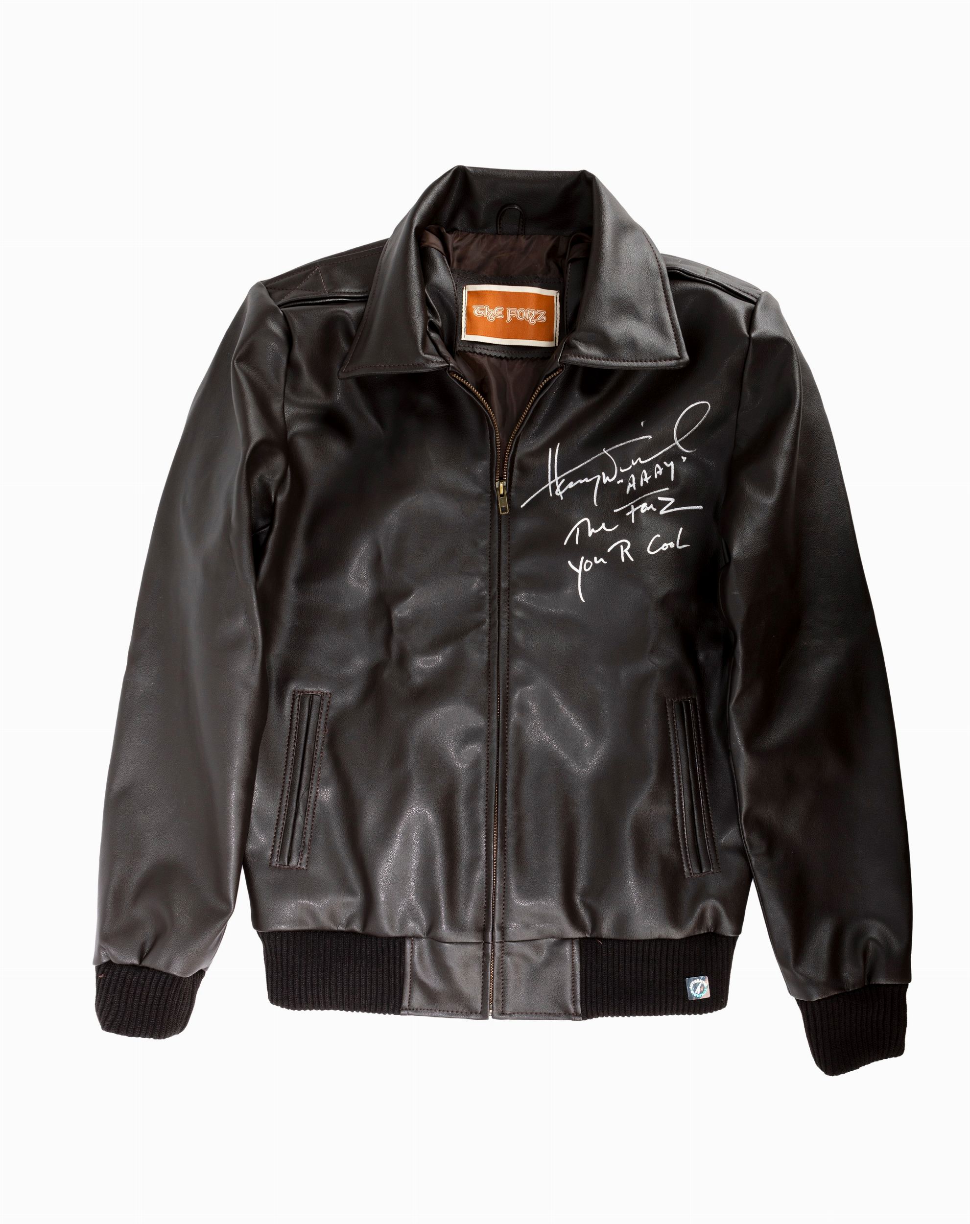 Giacca di Fonzie autografata da Henry Winkler con autentica. La giacca in asta è una fedele riproduzione, autorizzata da Winkler, autografata e con certificato di autenticità.