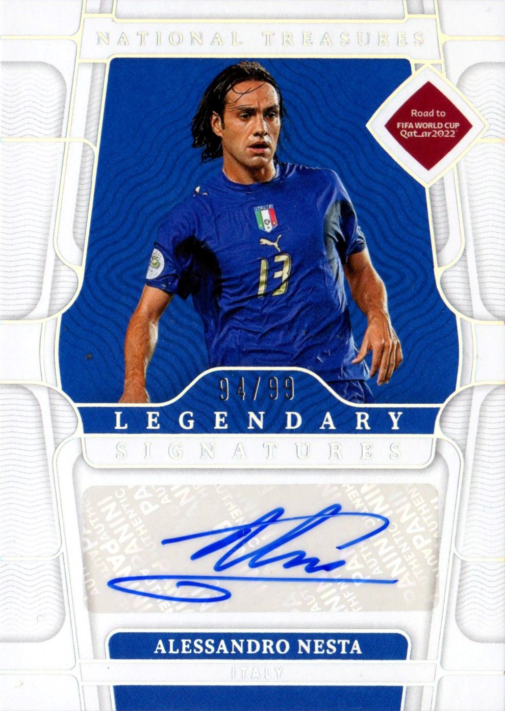 Card autografata da Alessandro Nesta, prodotta e certificata dalla Panini America con tiratura 94/99 nel 2022.