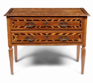 Comoncino a due cassetti lastronato ed intarsiato. Fine XVIII secolo
