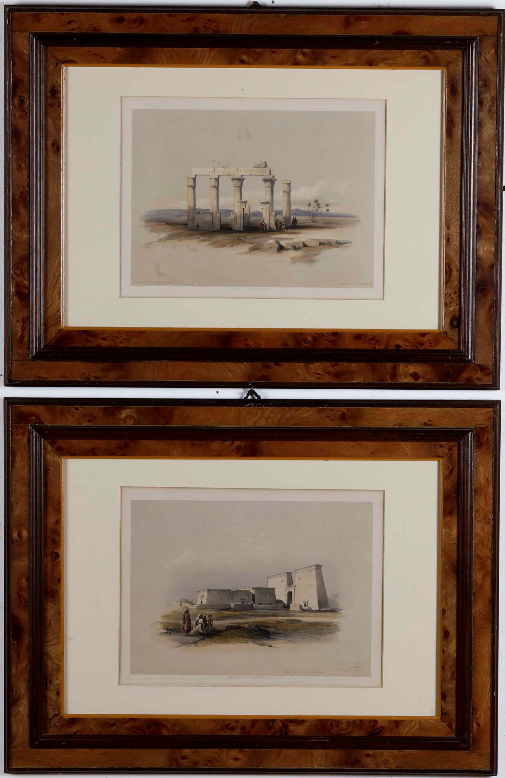 Coppia di stampe acquerellate con architetture e rovine. XIX-XX secolo