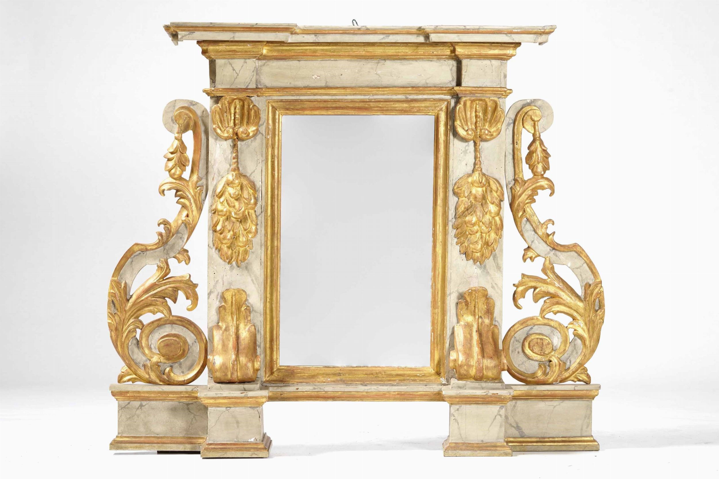 Cornice architettonica in legno intagliato, laccato a finto marmo e dorato. Italia [..]