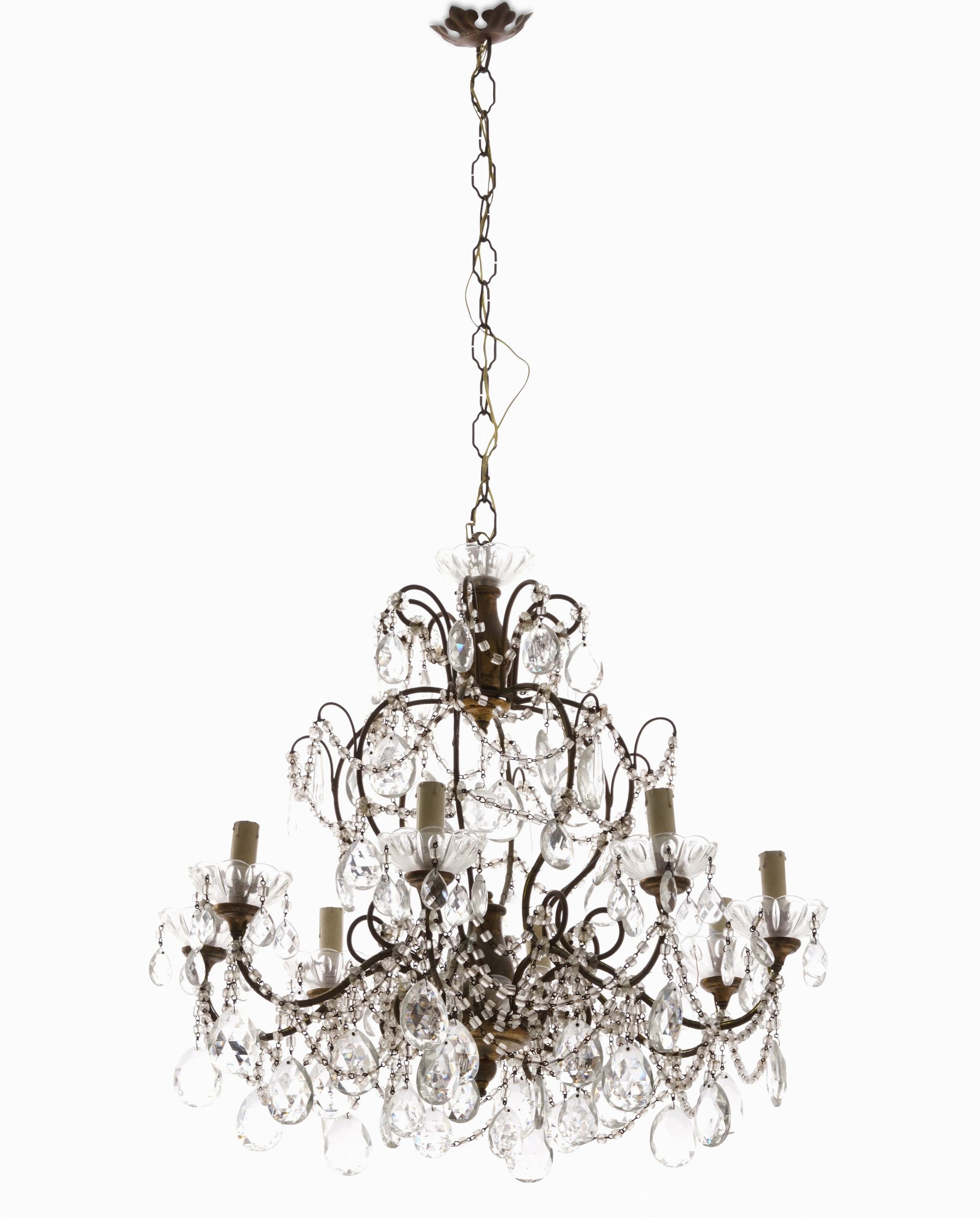 Lampadario a otto luci in metallo e vetro. XX secolo
